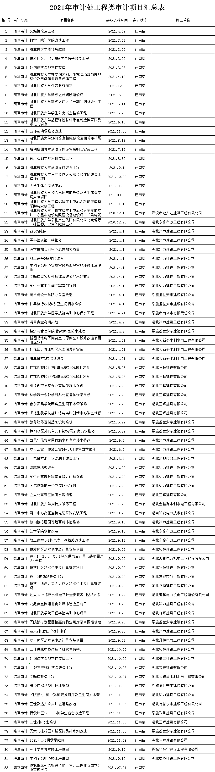 2021年审计处工程类审计项目汇总表