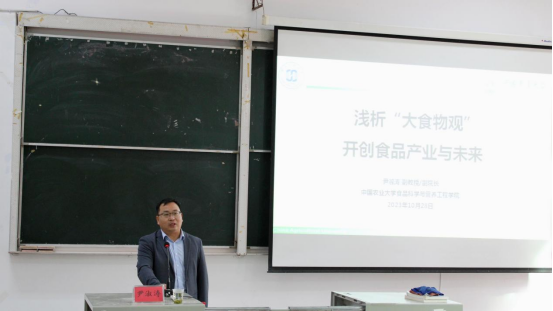 讲座伊始,尹淑涛教授以总书记“要树立大食物观”的观点进入主题。分别从“什么是大食物观”“大食物观的丰富发展”“为什么要树立大食物观”“大食物观下食品的发展与未来”“中国农业大学食品学科情况介绍”五个方面展开论述。讲座上尹教授强调树立大食物观对国家与人民的重要性,他指出“为实现农业(食品)从温饱型向功能、营养健康型转变,为更好满足人民对美好生活需求:我国进入社会主义现代化新征程,食物进入高质量发展新阶段的战略安排”。随后尹教授分享一本最近在看的书——《胜者思维》,并告诫在座同学“方向错了,停止就是进步”“抱怨者思维不是胜者思维,抱怨指责终将被社会淘汰”。 最后,尹教授展示了对于食品产业发展的研究,即围绕四个面向,瞄准食品科技国际前沿、瞄准乡村振兴和健康中国等国家重大战略、瞄准食品产业经济主战场,开展基础和应用研究工作。锻长板强优势、补短板蓄后势、促融合谋发展。