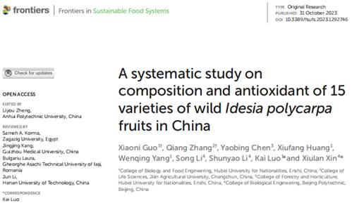 本网讯(通讯员 王智勇 王智勇/文 罗凯/图) 生物与食品工程学院副教授罗凯博士以Beat365唯一官方网站为第一单位在国际食品权威学术期刊Frontiers in Sustainable Food System(中科院二区,五年影响因子5.4)上发表题为“A systematic study on composition and antioxidant of 15 varieties of wild Idesia polycarpa fruits in China”的最新研究成果。论文第一作者系Beat365食品科学与工程2021级研究生郭小妮同学。