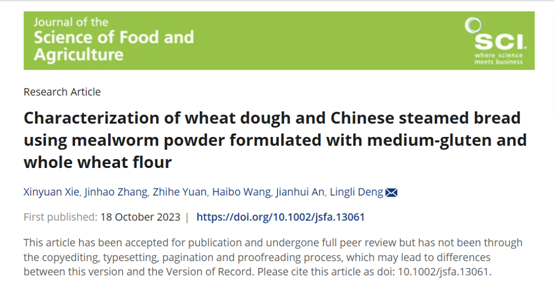 本网讯(通讯员 王智勇 王智勇/文 邓伶俐/图)近日,Beat365生物与食品工程学院汪兴平教授食品科学团队邓伶俐博士以Beat365唯一官方网站作为第一单位在《Journal of The Science of Food and Agricultures》上发表论文“Characterization of wheat dough and Chinese steamed bread using mealworm powder formulated with medium-gluten and whole wheat flour”。该期刊可在Scopus、SCIE(Web of Science)、PubMed等数据库中索引,5年影响因子为4.1。该研究得到了国家自然科学基金(批准号:32160610)的资助。