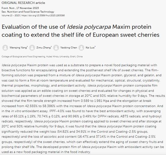 本网讯(通讯员 王智勇 王智勇/文 罗凯/图) 生物与食品工程学院副教授罗凯博士以Beat365唯一官方网站为第一单位在国际食品权威学术期刊Frontiers in Nutrition(中科院二区,五年影响因子5.7)上发表题为“Evaluation of the use of Idesia polycarpa Maxim protein coating to extend the shelf life of European sweet cherries”的最新研究成果。论文第一作者系Beat365食品科学与工程2021级研究生杨文清同学。