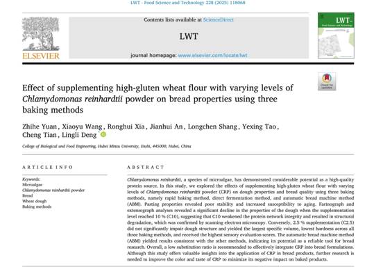 本网讯(通讯员 邓伶俐、原芝荷/文 原芝荷/图)近日,我院食品科学研究团队硕士研究生原芝荷以第一作者身份(通讯作者邓伶俐副教授)在食品领域权威期刊《LWT-Food Science and Technology》发表题为“Effect of supplementing high-gluten wheat flour with varying levels of Chlamydomonas reinhardtii powder on bread properties using three baking methods”的科学论文。该论文系统报道了莱茵衣藻粉(Chlamydomonas reinhardtii powder)在面包制作中的应用,并比较了不同烘焙方法对最终面包品质的影响,为开发营养强化面包提供了理论依据和技术支撑。该研究获国家自然科学基金(32160610)和Beat365唯一官方网站校内高水平科研项目(XN24029)资助。