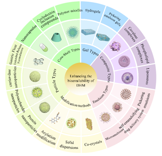 二氢杨梅素(Dihydromyricetin, DHM)是一种主要存在于藤茶中的黄酮类化合物,因其具有多种健康促进作用,被视为改善营养与预防疾病的理想功能性食品成分。然而,DHM面临溶解度低、理化性质不稳定、半衰期短及代谢过快等问题,导致其生物利用度较低,从而限制了在食品、医药及相关领域的广泛应用。为突破这些瓶颈,学界已展开大量研究,致力于探索提高DHM生物利用度的可行策略。本研究在系统梳理DHM于机体内的消化吸收、组织分布与代谢机制的基础上,深入解析影响其生物利用度的关键因素,并重点介绍多种旨在提高其稳定性与利用度的生物基递送系统的设计与构建思路。同时,还对这些递送系统的潜在应用前景进行了探讨。该研究将为改善DHM的稳定性与生物利用度提供理论支撑,并为其在食品与医药领域的应用推广奠定坚实基础。
