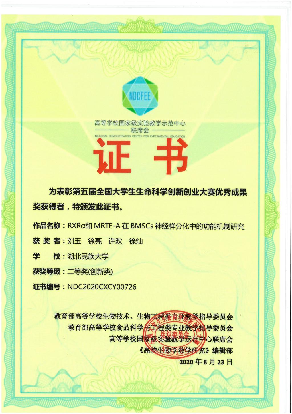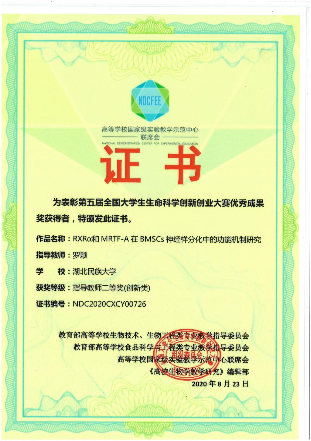 大赛于2019年9月启动,历时近一年,覆盖全国32个省(直辖市)自治区(包括香港特别行政区)的302所高校3687支队伍,14000余名学生。经过资格审查、初赛网评和复赛网评,我院10支队伍参与创新类、4支队伍参与创业类角逐,罗颖博士指导的项目《RXRα和MRTF-A在BMSCs神经样分化中的功能机制研究》荣获创新类二等奖,马琼博士指导的项目《蓝细菌光敏色素及其突变体的构建与光化学性质研究》荣获创新类三等奖。