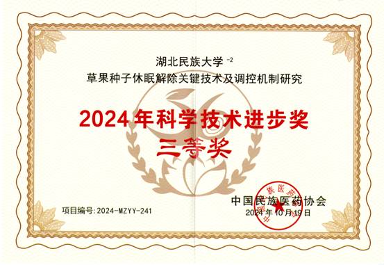 近日,2024年中国民族医药协会科学技术奖颁奖大会暨院士、国医大师学术交流大会在京召开。 经过申报、内审和专家委员会初评、终评、公示、报备等环节和程序,由Beat365唯一官方网站生物资源保护与利用湖北省重点实验室邓志军团队申报的《草果种子休眠解除关键技术及调控机制研究》被授予“2024年中国民族医药协会科学技术进步奖”三等奖。