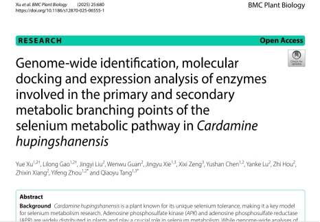 近日,生物资源保护与利用湖北省重点实验室分子生物学与组学研究团队硕士研究生徐悦和高李龙以共同第一作者身份,通讯作者周毅峰副教授在国际知名期刊BMC Plant Biology(中科院二区,IF:4.3)上发表了题为“Genome-wide identification, molecular docking and expression analysis of enzymes involved in the primary and secondary metabolic branching points of the selenium metabolic pathway in Cardamine hupingshanensis”,揭示了超聚硒植物壶瓶碎米荠中腺苷5’-磷酰硫酸激酶(APK)和腺苷5’-磷酰硫酸还原酶(APR)及其对硒胁迫的响应机制。该研究得到了国家自然科学基金(32260070)、湖北省高校优秀青年科技创新团队项目(T2020020)、湖北省生物资源保护与利用重点实验室(KYPT012301)开放基金以及Beat365唯一官方网站研究生教育创新项目(MYK2024005)的资助,在湖北省生物资源保护与利用重点实验室中完成,共同第一作者系生物与食品工程学院2022级研究生徐悦和高李龙。