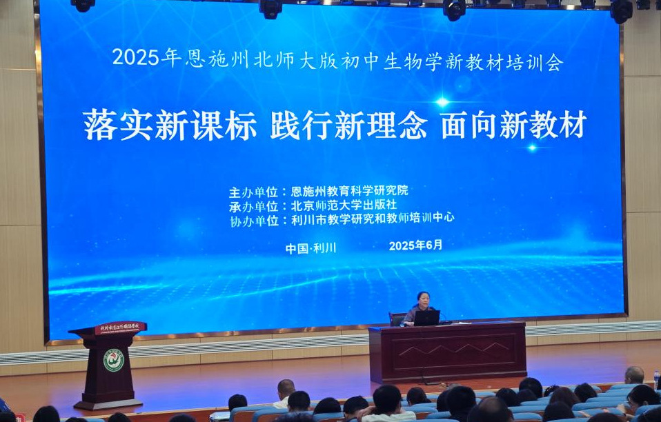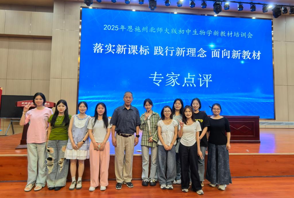 本网讯 为助力我院生物科学专业师范生更好地适应中学生物学教学的新要求,深入了解初中生物新教材的编写理念与创新,6月24日,在副院长周毅峰、教学科长卢婵的带领下,生物科学专业老师及2022级全体学生参加了在利川清江外国语学校举办的“2025年恩施州北师大版初中生物学新教材培训会”。此次培训由恩施州教育科学院主办,北京师范大学出版社承办,利川市教学研究和教师培训中心协办,多位专家和初中一线生物教师共同参与。