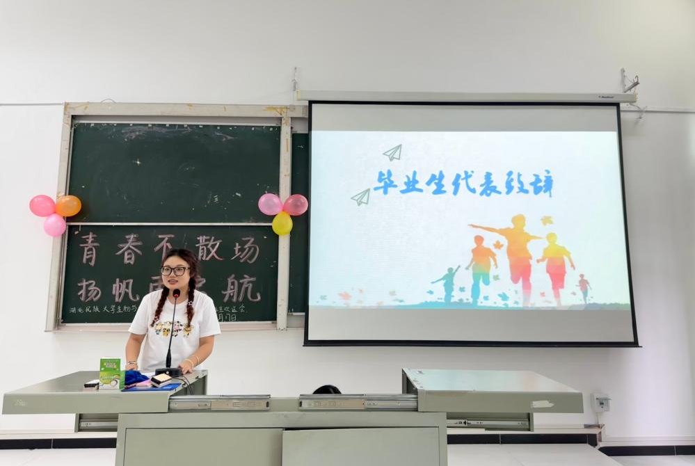 欢送会在热烈的掌声中拉开序幕,首先,陈杰发言。他深情回顾毕业生们在校期间的成长历程,并对他们的努力和成就给予高度评价。并播放毕业纪念视频,回顾属于毕业生们的青春美好,鼓励毕业生们要继续发扬母校的光荣传统,勇敢面对未来的挑战,不断追求卓越。