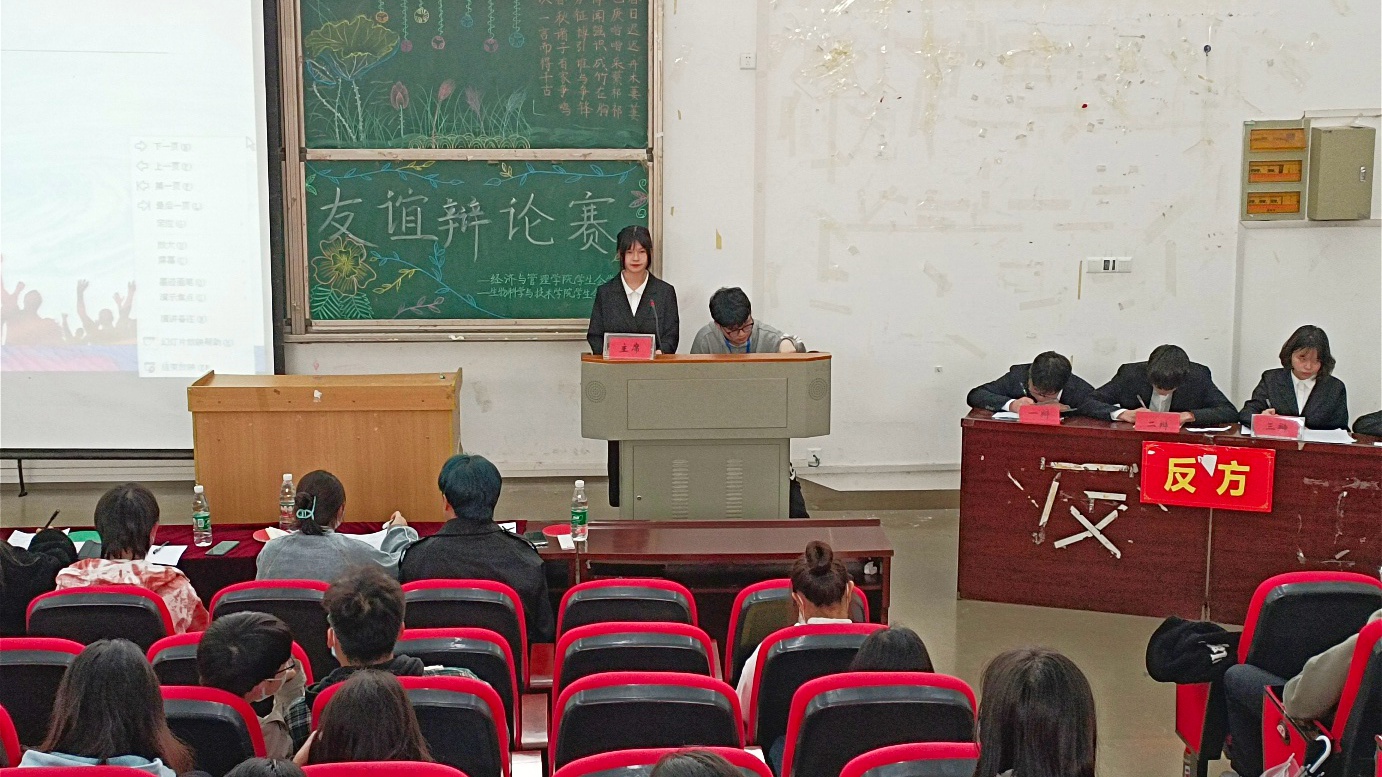 本网讯(见习通讯员 王元 朱小娟/文 见习通讯员 黄慧娴/图)为促进各院间的交流,并提高我院辩手的辩论水平,增强我院辩手的语言表达能力4月17日下午两点半,我院联合经济与管理学院举办的友谊辩论赛于修远楼5B404教室拉开帷幕。我院优秀辩手原芝荷、学生会学风建设部部长邓子言,经济与管理学院优秀辩手皮南瑾、王岩担任评委,陈洁担任主席,近两百人观看此次比赛。