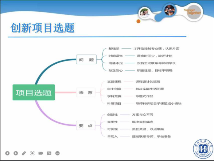 随后,邱达老师从问题、来源、要点三大角度讲解创新项目选题。其中,他结合“自拍杆”“电视卫星锅”等具体实例,提出要细心观察生活,才能以“小”见“大”,找到创新点。同时,邱老师结合“创新性”“实用性”“可实施”等特点分享选题经验。最后,他结合自身指导学生的经验,指出在申报大创项目时,遵循“从理论到实践,从模块到系统,从模仿到超越”的逻辑,可以达到快速入手、逐步完善的效果。