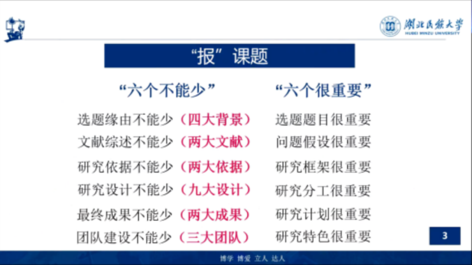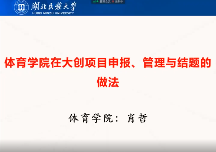 肖哲老师围绕《大创项目、管理与结题的做法》,重点分享了体育学院“以研促创”模式,以及在这种模式下体育学院做出的积极调整和详细方案。同时,他指出要积极发挥社团优势,鼓励学生跨学科申报。最后,肖哲老师结合体育学院运动科学研究团队这一具体实例,强调学生在实地调查中的重要作用,并展示了体育学院运动科学研究团队相关项目立项过程,以帮助大学生形象化理解大创项目申报过程。