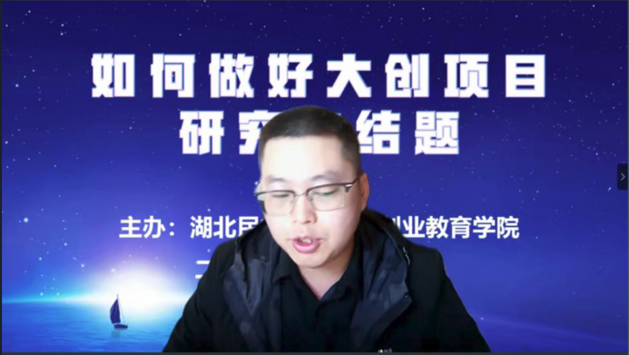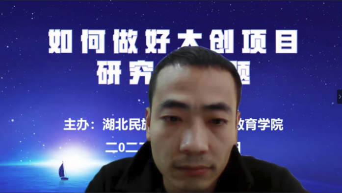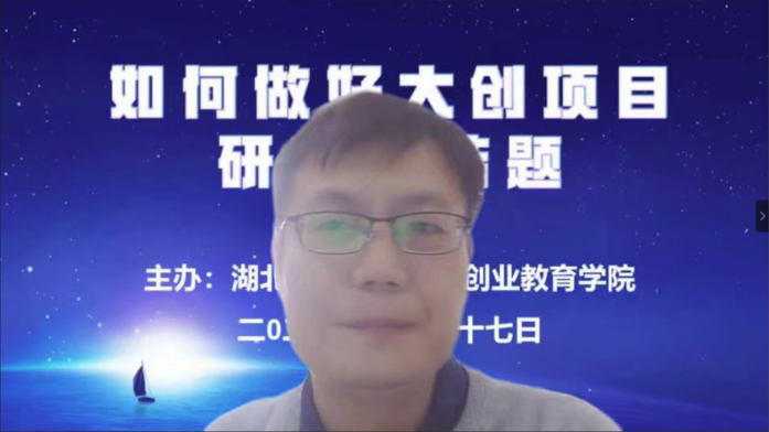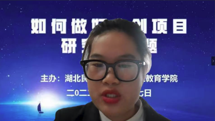 教师教育学院学科建设与研究生管理办公室主任邹太龙、智能科学与工程学院教师邱达、体育学院创新实践中心主任肖哲、文学与传媒学院2019级新闻系学生魏源源四位嘉宾,分别作了《大创项目的申报、实施与结题》《大学生创新创业项目选题及实施探讨》《大创项目申报、管理与结题的做法》《大创项目研究经验分享》的报告。创新创业教育学院李永诚副教授主持学术沙龙。