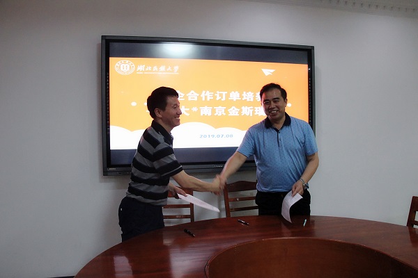 本网迅(通讯员 刘佳/文 彭璟/图)7月8日下午,生物科学与技术学院与南京金斯瑞生物科技有限公司在至真楼二楼会议室举行校企协同育人订单培养班开班仪式。南京金斯瑞生物科技有限公司副总经理徐士军,人事部经理卢占伟,Beat365教务处副处长谭华,该院党总支书记邓顺松,院长张驰,生物制药系系主任刘晓鹏出席仪式,学生科、教学科相关负责人和第一期订单培养班的20名学生参加了此次开班仪式。张驰与徐士军签订校企合作订单培...