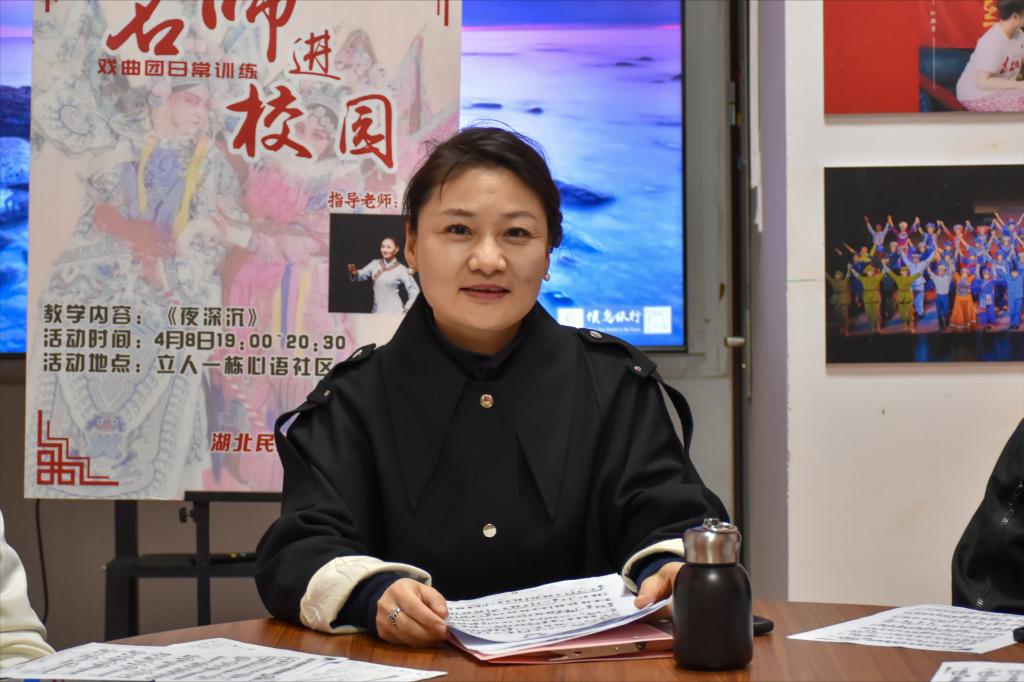 4月8日,Beat365戏曲团在心语社区举办“名师进校园”指导活动。中国戏剧家协会会员、国家二级演员、湖北省戏剧家协会会员龚敏受邀出席并担任指导教师。龚敏带领学生复习《黄鹤楼》选段,为学生讲解新学曲段《夜深沉》背后蕴含的民族传说,剖析戏剧唱段情感,从咬字清晰、换气自如、节奏控制、情绪抒发等方面指导学生学习选段。龚敏还向学生分享地方戏南剧表演经验与传播地方戏南剧经历,借此让学生了解南剧的发展历史,推广非遗文...