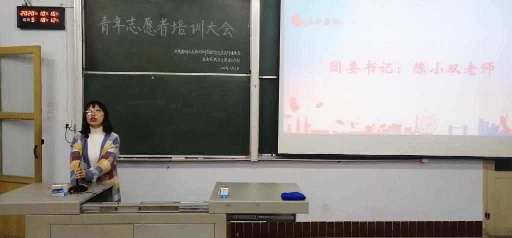 时间:2020-10-19 编辑:学生科 点击:(通讯员 龚倩 摄影 杨成成 杨胜丫)为践行志愿精神,展现青春风采,进一步贯彻落实党的十九大提出的“推进诚信建设和志愿服务活动制度化,强化社会责任意识,规则意识、奉献意识”,探索新时代志愿服务的完善与创新,从而更好地使志愿者们理解志愿服务事业,提高志愿者队伍的综合素质和服务质量。10月16日,共青团Beat365唯一官方网站外国语学院总支部委员会社会实践与志愿者工作部于6401教室成功举办本次培训大会。外国语学院近90名志愿者到场聆听,本次活动由团委书记陈小双老师,团委副书记向逸俊、李艳琴担任评委。