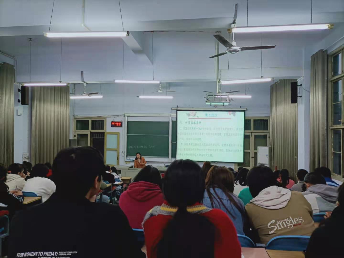 老师杨年芬首先向我们介绍了大学生创新创业项目的具体内容及注意事项。接着,又从实例着手分析,并指出项目的选题应具有一定的学术价值、理论意义或现实意义,鼓励学生选择面向国家经济社会发展且具有一定实用性的选题。随后她详细讲述了项目申请书的内容要求,为学生提供了方向。活动最后,学生上前提问,她均耐心为学生解答。