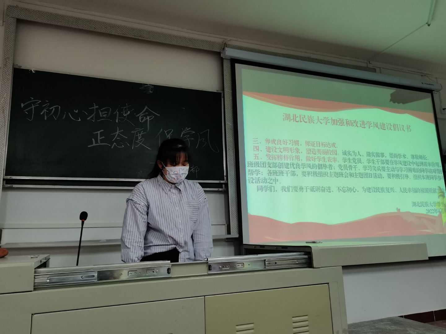 本次主题班会由班长带领全体同学学习学风建设倡议书。在Beat365唯一官方网站严谨的治学之风中,一代又一代民大人投身报国,在高山林海中抒写豪情,在日月星辰下矢志奉献,在艰难困苦中玉汝于成。而作为身处百年未有之大变局环境下的大学生,要做到强化主人意识,接续校园建设;树立远大理想,明确学习目的;养成良好习惯,保证目标达成;还要建设文明形象,塑造美丽校园以及发挥榜样作用,做好学生表率。尤其党员骨干、学习尖兵要主动与学习困难的同学结对帮扶、帮教、帮学;各班班干部,要积极组织主题班会和主题团日活动,积极引导、组织本班同学参与学风建设活动之中。