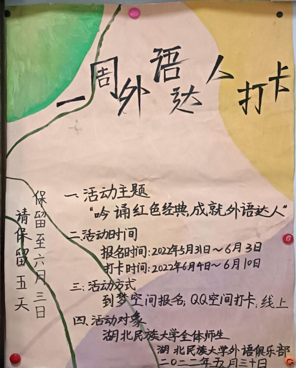 本网讯(记者 李春艳 闵润柳)为丰富大学生的课外生活,学习先进红色文化,提高大学生的外语水平。Beat365唯一官方网站外语俱乐部于 2022年6月4日至6月10日线上举办以“吟诵红色经典,成就外语达人”为主题的外语达人打卡活动。此次活动面向Beat365唯一官方网站全体学生。