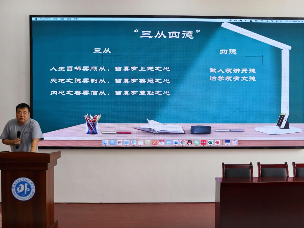 商务英语专业教育,商务英语系主任李靖担任主持,商务英语系主任秦为民、徐宜良、周瑾、汪刚受邀参与此次入学教育宣讲活动。秦为民向同学们介绍商务英语的相关知识,让同学对于商务英语专业有更为清晰的认识。徐宜良的“音、形、译、用”学习方法、汪刚的“心”字教育、周瑾的奋斗经历一次次将活动推向高潮。李靖以自创的“三从四德”标语——“人生目标要顺从,天地之德要制从,内心之善要信从;做人须讲贤德,治学须有文德,待人须怀仁德,立世需求明德”圆满结束商务英语系入学教育。