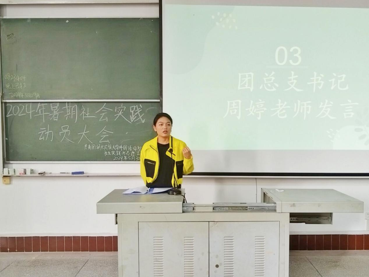 活动最后,团总支书记周婷老师作总结发言。她鼓励在场同学选择既对社会进步具有积极意义又能促进个人成长的项目。同时,她强调,每一位走出校门的同学都代表着学校的形象,应该在社会实践过程中展现出民大学子的礼仪和素养,既在社会实践过程中将所学的理论知识内化于心、外化于行,又在踏入社会的人际交往中真正习得本领、增进担当。