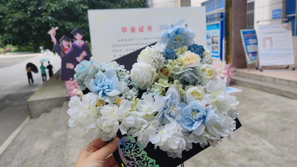 6月19日,同学们来到外院大厅,选择心仪的仿真花、珍珠胶、特色贴纸,根据学士帽的形状、颜色以及个人喜好,来设计学士帽簪花的主题与风格。在阳光下,他们慢慢地将回忆与希望的花,一朵朵镶嵌在学士帽上。这是一场古韵今辉的交叠,更是来时路与未来途的浪漫相遇。愿每一位毕业生都能在未来的人生旅途中,熠熠生辉,繁花似锦,书写自己的辉煌篇章。