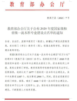 近日,根据《教育部办公厅关于公布2020年度国家级和省级一流本科专业建设点名单的通知》(教高厅函〔2021〕7号),经各高校网上申报、高校主管部门审核,教育部高等学校教学指导委员会评议、投票推荐,教育部认定了3977个国家级一流本科专业建设点。同时,经各省级教育行政部门审核、推荐,确定了4448个省级一流本科专业建设点。我院英语专业获批湖北省一流本科专业建设点和国家级一流专业建设点。