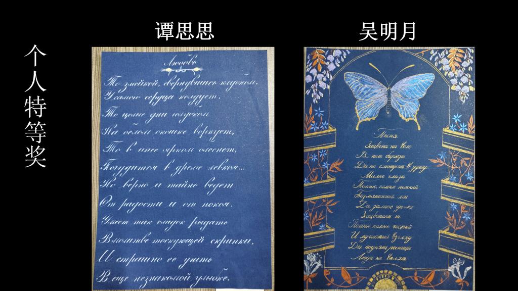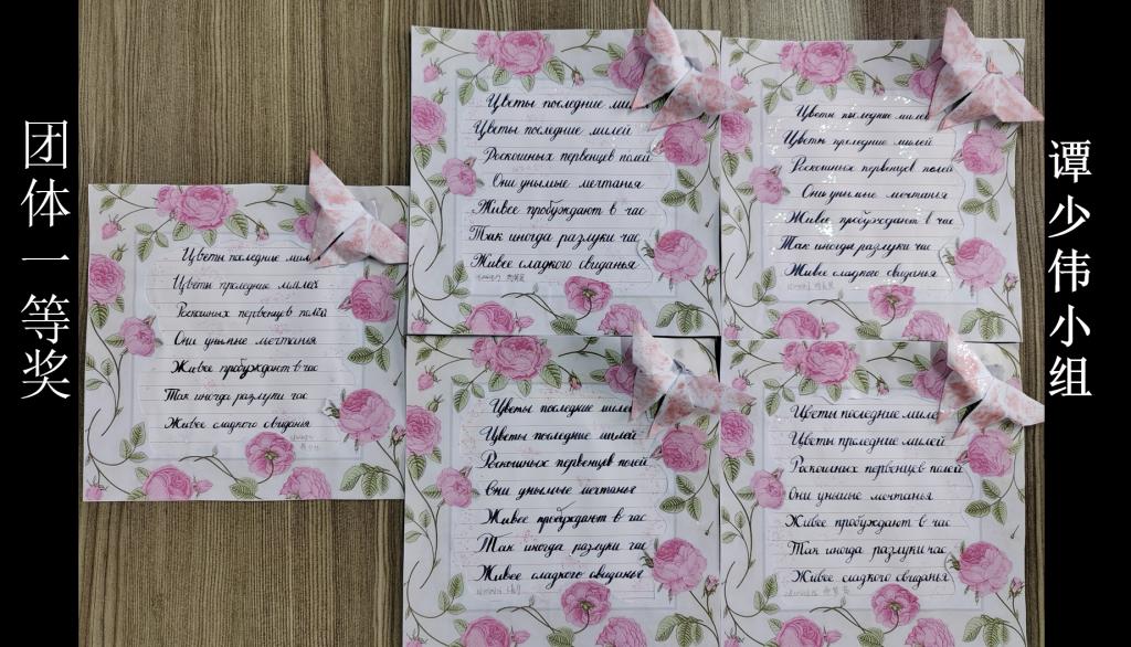 外国语学院2023年春季学期的诗歌书写大赛由俄语书写大赛、第二届英语书写大赛等一系列赛事组成,在上学期参加第二届全国大学俄语书写大赛中取得技压群雄的优异成绩之后,本次大赛中学生个人和团队的书写作品都呈现出更上一层楼的审美情趣和创新能力:佳作缤纷涌现,无论是书写还是作品表现形式,内外都是盈溢的诗意。连续经历多场俄语书写大赛的二外俄语学生在本次大赛中,无论是英语书写水平,还是作品审美趣味上,都一如既往地技压群雄。