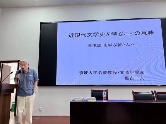 时间:2024-10-10 编辑:办公室 点击:9月25日下午,日本筑波大学名誉教授、著名文艺评论家黑古一夫教授应邀在我院学术报告厅为日语专业师生做题为“学习日本近现代文学史的意义”的学术讲座。本次讲座由日语系主任陈知清主持,外国语学院党总支书记罗成富出席,日语系师生近一百人聆听讲座。