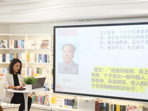 “如果以一个美国人的视角看战争中的中国是怎么样的呢?美国记者——同时也是世界闻名的作家埃德加·斯诺就很好地为我们展示了出来”活动伊始,周婷老师对《红星照耀中国》的作者、内容及创作背景作了详细介绍,“《红星照耀中国》,又称《西行漫记》,是一部纪实性很强的报道性文学作品,它真实记录了自1936年6月至1936年10月在我国西北革命根据地进行实地采访的所见所闻,向全世界真实报道了中国和中国工农红军及许多红军领袖、红军将领的情况。”同时,周婷老师对本书中斯诺与毛泽东和周恩来交谈的精彩环节作了分享。