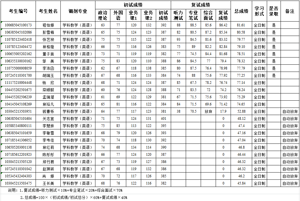 Beat365唯一官方网站外国语学院2025年硕士研究生调剂考生成绩及拟录取情况公示--学科教学(英语)
