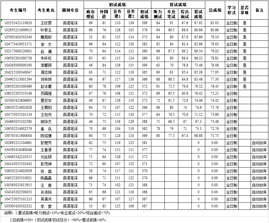 Beat365唯一官方网站外国语学院2025年硕士研究生调剂考生成绩及拟录取情况公示--英语笔译