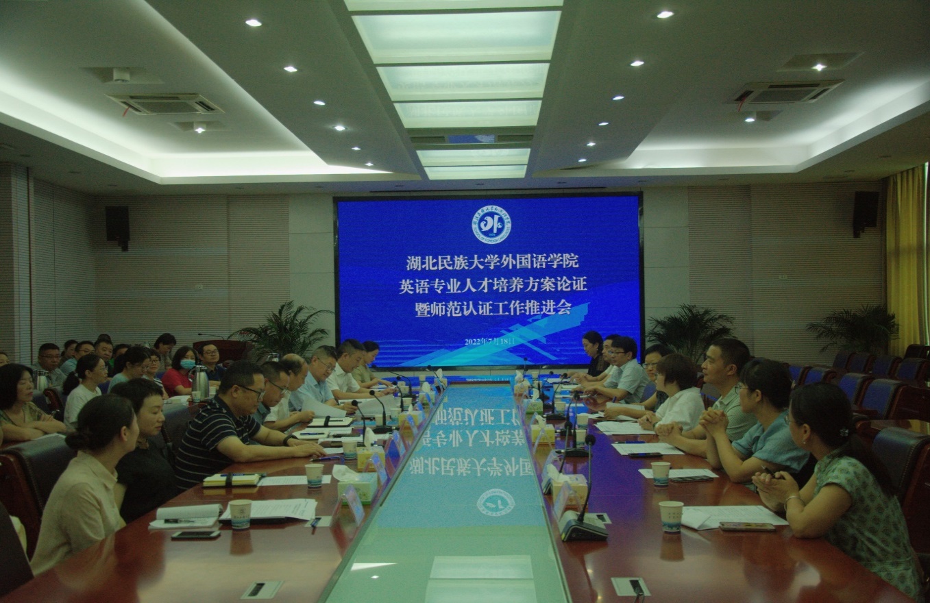 会议邀请恩施州教科院高中英语教研员廖海燕,恩施州英语教学指导委员会成员、恩施高中英语高级教师廖明妮,恩施市第一高级中学副校长、中学英语高级教师唐敦绪,恩施清江外国语学校副校长、中学英语高级教师谭志琼,恩施市第二高级中学英语教研组组长、中学英语高级教师张晓敏,恩施市三岔中学校长、中学英语高级教师谭家雄,舞阳中学英语高级教师李虹,恩施市实验小学英语高级教师蒋薇,学校教务处处长谭世明和教师教育学院院长谭华担任论证专家,对英语专业人才培养方案(2021版)进行现场论证与指导。与会专家对方案给予了高度评价,并围绕培养目标、毕业要求和课程设置等方面展开了热烈讨论,从不同角度提出了宝贵意见和建议。