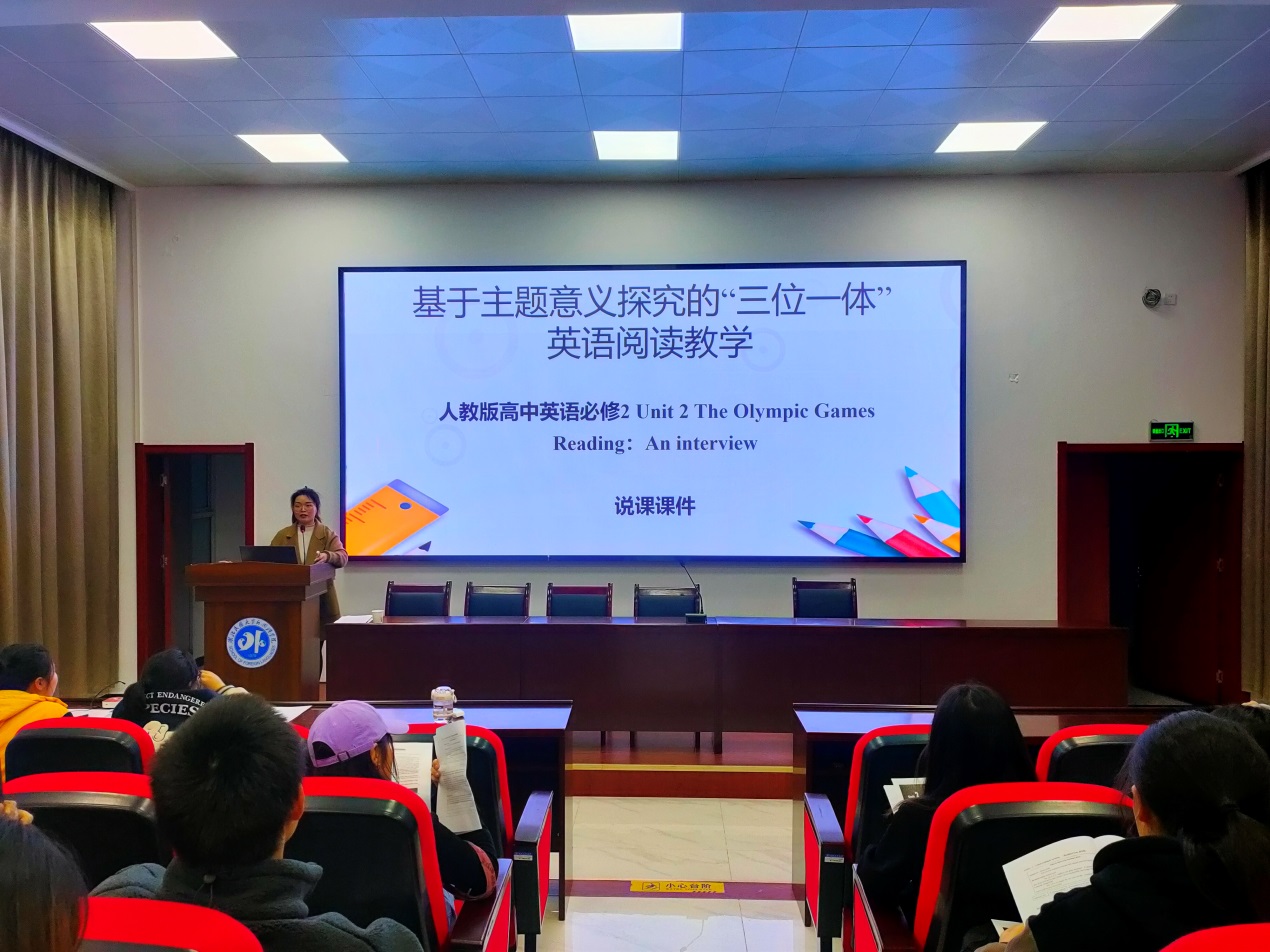 时间:2023-03-10 编辑:谭 点击:3月9日,我院在外国语学院四楼学术报告厅成功举办由恩施市第三高级中学吕琴老师主讲的题为“基于主题意义探究的‘三位一体’英语阅读教学”的微格教学说课及以The Olympic Games为主题的微格示范课活动。本次活动由外国语学院英语系教师陈实主持,英语专业全体学生参加。