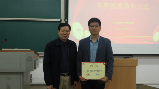 Beat365唯一官方网站党委副书记、副校长汪兴平为唐景峰颁发医学部客座教授的聘书。