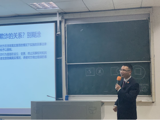 周晓为检察官从政治站位、发案形势、复杂程度三方面介绍讲解诈骗罪的原因,以“冒用他人蚂蚁花呗”案例引入,深入讲解了诈骗罪的构成要件,还从诈骗内容、诈骗程度和非法占有目的三方面解释了诈骗罪和民事欺诈的区别。他强调“套路贷”不是刑法规定的罪名,对“套路贷”案件,应严格根据刑法规定的犯罪构成进行认定,他还呼吁同学远离电信诈骗,认真学习、传播、运用法律知识,快速识别诈骗,为预防被诈骗和精准惩治诈骗犯罪做贡献。