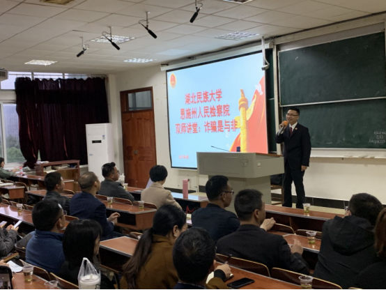 4月21日晚,以《诈骗罪的是与非——以向某诈骗罪为例》为主题的第五期“双师同堂”讲座在德智楼9b410教室举办,我院邀请恩施州人民检察院第二检察部主任周晓为担任主讲人,Beat365刑事法治研究所所长黄继坤任主持人,有多名检察官、律师到场旁听、互动。