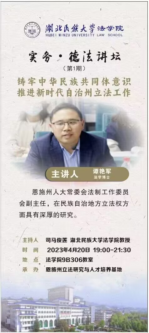 本网讯(见习记者 吕庆陆/文 罗长青/图)4月20日,“铸牢中华民族共同体意识 推进新时代自治州立法工作”实务讲座在法学院9B306教室成功举办,由恩施州人大常委会法制工作委员会副主任谭艳军博士主讲,我院司马俊莲教授担任主持人,部分教师与学生参与本次讲座。