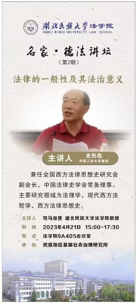 本网讯(记者 姚璐/文 黄卓然/图)421日,“法律的一般性及其法治意义”学术讲座在法学院9A405会议室成功举办中国人民大学史彤彪教授主讲,我院司马俊莲教授担任主持人,部分教师与学生参与本次讲座。