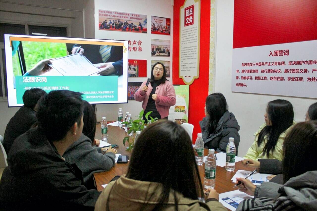 本网讯(记者 袁本怡 见习记者 邹跃宁/文 田伊俐/图)11月29日,我院立足于校团委“一站式”社区团学服务站之青春成长计划“模拟选岗余简历精修工作坊”项目,于立人1栋心语社区举办以“法眼识岗”为主题的模拟选岗与简历精修辅导活动。我院团总支书记谢学婧主持,10余名本科生到场参与。
