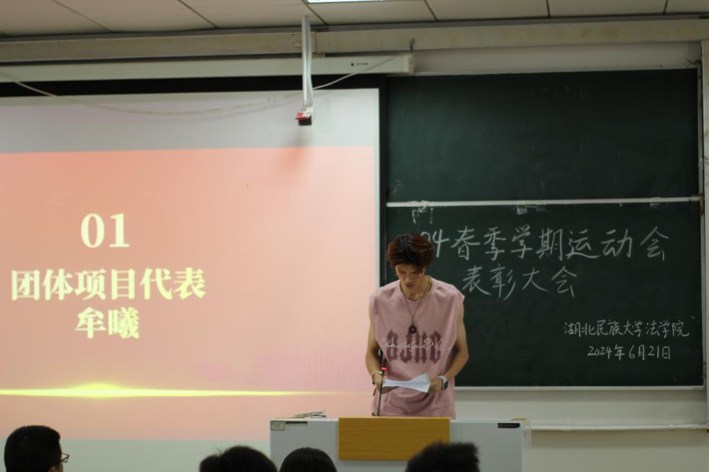 大会伊始,老师与学生一同观看法学院运动会剪辑短片,回顾精彩瞬间。接着,阙嘉苗老师宣读运动会表彰人员名单并邀请运动员与工作人员代表发言。牟曦、苏麦亚·孜比布拉、李一飞分别作为团体项目代表、突出贡献奖代表、十佳运动员代表,表达了对全体运动员和工作人员的感谢和对法学院的热爱。随后,老师们为获奖学生颁发荣誉证书。最后,张明波书记进行总结发言,对获奖学生表示祝贺,希望今后同学们可以保持佳绩,再创辉煌。