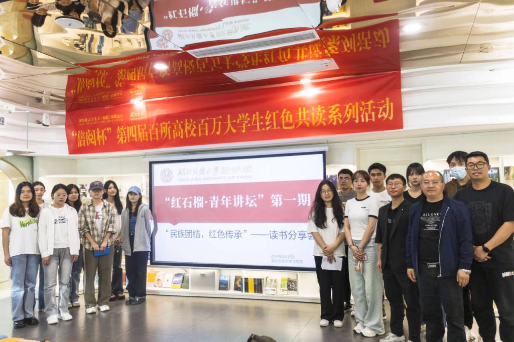 本网讯(记者 袁本怡/文 唐诗媛/图)4月25日,我院于倍阅书店举办以“民族团结,红色传承”为主题的读书分享会。学生工作处民族事务中心谭学文、董特及法学院学生党支部书记彭阳受邀出席,法学院部分少数民族学生参加本次活动,艾仁同学担任活动主持人。