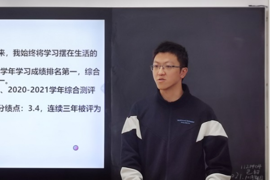 活动伊始,许宗友书记简要介绍答辩会的流程和评审规则。秉持公开、公平、公正、择优的评审原则,12名候选同学现场抽签依次进行答辩。此次答辩分为个人陈述、PPT展示以及评委提问三个环节。候选学生通过PPT展示从思想政治、学习成绩、社会实践、竞赛成果等方面进行陈述,展现自我风采。