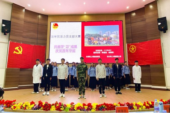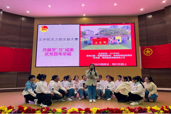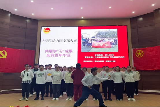 本网讯(见习记者 许帅伟 苏浩楠 喻晓凡/文 刘皇 李经玺/图)万里河山风雨急,千年英杰才情萃。为庆祝中国共产党百年华诞,共展学“习”成果,4月2日,我院于图书馆学术报告厅举办法学院活力团支部大赛。19级、20级共七个团支部参与此次比赛,文学与传媒学院团总支书记谭芸、信息与工程学院团总支书记谭俊妮、我院团总支书记阙嘉苗受邀担任此次比赛评委,党总支副书记许宗友受邀出席大赛。