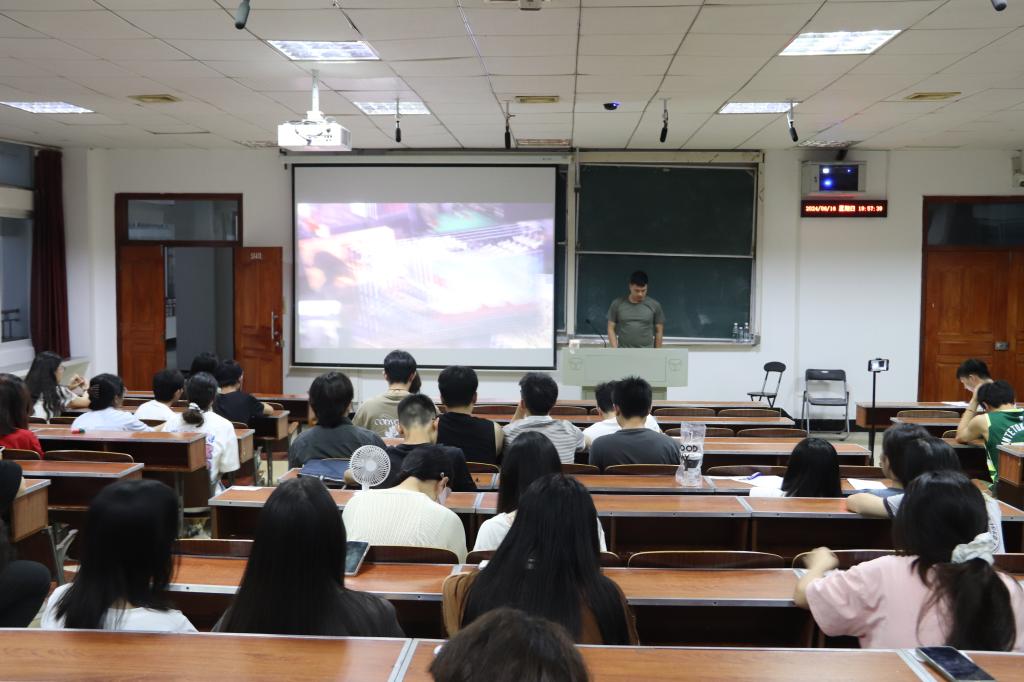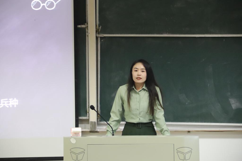 活动开始由李一飞同学讲解征兵政策,对服兵役义务、入伍待遇、入伍流程与时间节点做了仔细讲解。接着,杨晓芳同学介绍基本兵种与女兵训练日常。最后由李飞同学补充讲解男兵部队生活,分享入伍心路历程。通过观看视频与互动问答,现场氛围十分热烈。