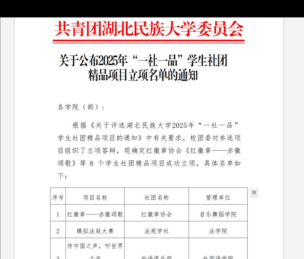 图为2025年校团委社团一社一品立项公示名单