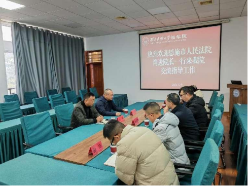 在交流活动中,肖进院长首先对恩施市人民法院近几年的人员结构、工作重点、工作难点、工作成效等基本情况进行了简要介绍,对学院一直以来给予恩施市人民法院的支持表示感谢,希望双方进一步深化合作交流、落实具体措施,在提高审判专业化水平和学生实习实训成效上能够取得新的突破。