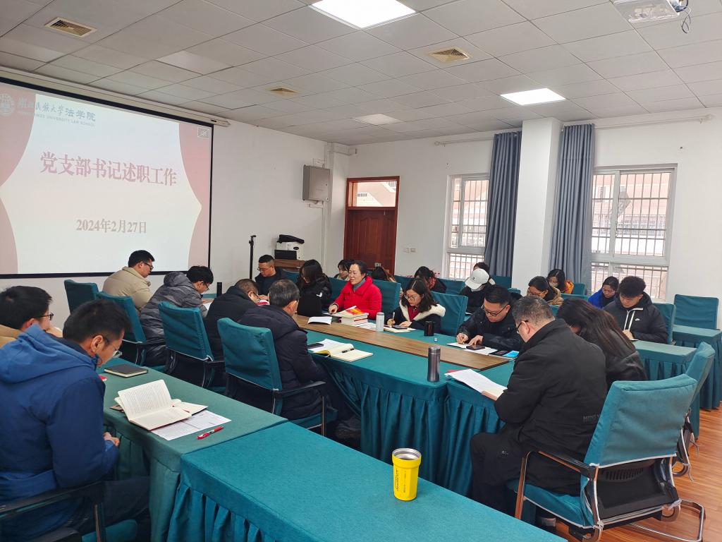 2月27日,法学院2023年度党支部书记抓党建工作述职评议考核会召开。校党委委员、法学院院长兼党总支副书记汪燕,法学院党总支副书记黄晓波,法学院党总支委员、副院长李文革、蔡世鄂,以及各师生党支部书记等参加会议。会议由法学院党总支书记张明波主持。