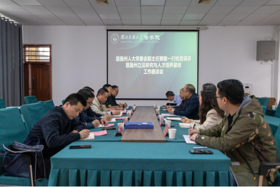 首先,汪燕院长汇报了恩施州立法研究与人才培养基地的主要工作情况。基地自2019年建立以来,围绕章程建立工作机制、围绕地方立法创建智库平台以及围绕提档升级加强对外交流,尽力发挥“一库三平台”功能。基地立法理论研究成果丰硕,先后获得国家社科基金一般项目3项,立法相关省部级项目3项,在CSSCI期刊发表相关论文近10篇,1篇论文在人民日报理论版发表,获湖北省有关领导肯定性签批成果2项,出版相关学术专著2部。汪燕院长指出,未来将倾力为恩施州建成“两山”实践创新示范区,为湖北省建成全国构建新发展格局先行区贡献立法基地的智慧和力量。