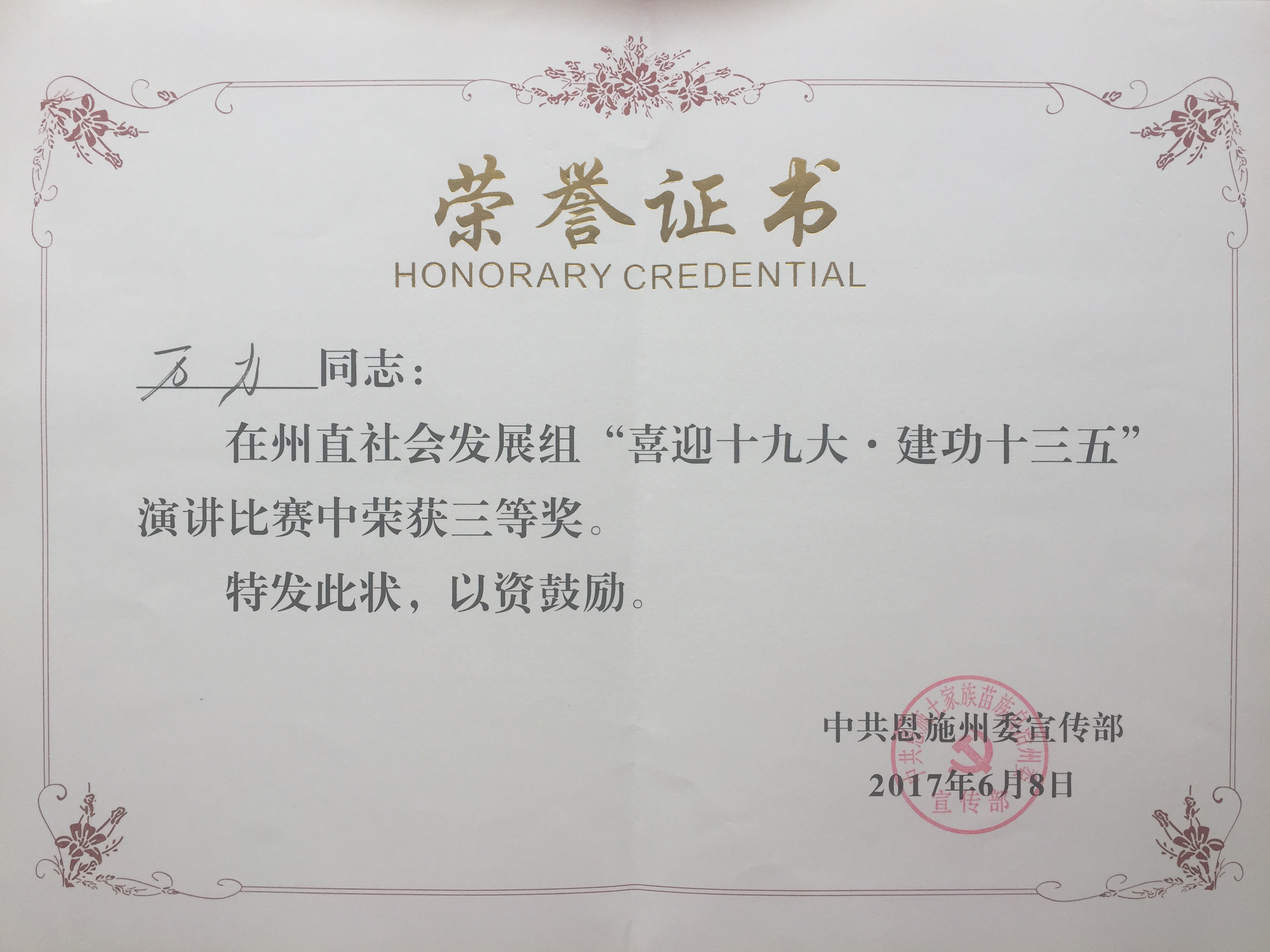 Beat365万力老师在州委宣传部、州委州直机关工委、州总工会联合举办“喜迎十九大.建功十三五”演讲比赛中荣获社会发展组三等奖。