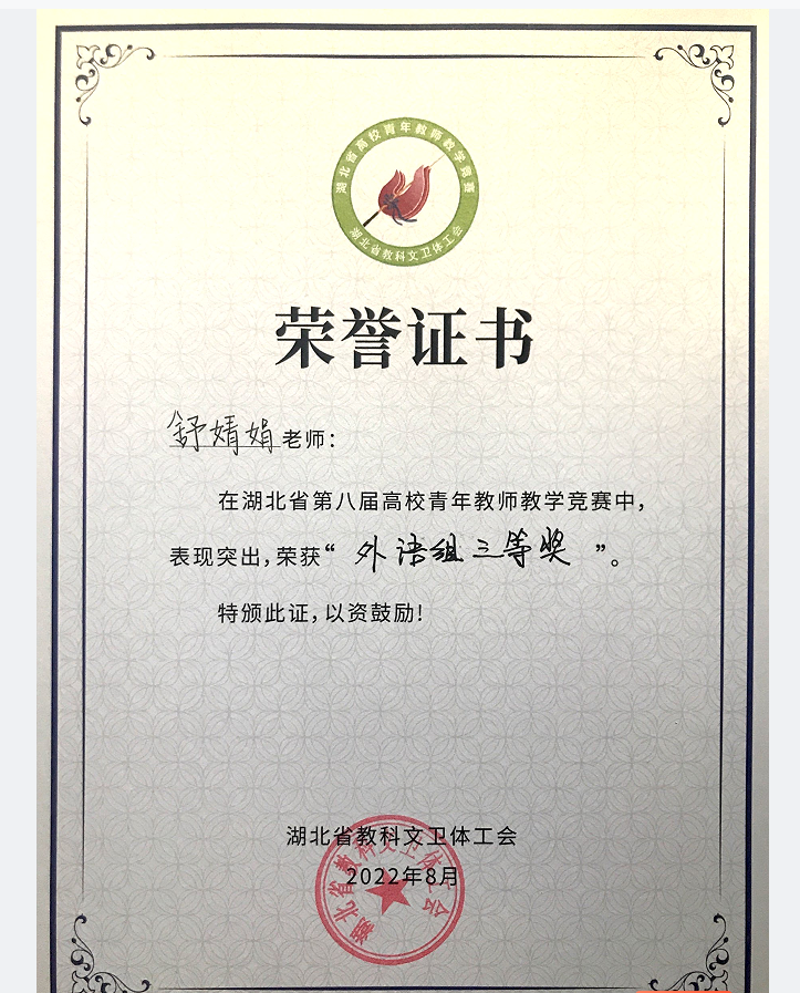 Beat365外语学院舒婧娟老师在湖北省第八届高校青年教师教学竞赛中喜获外语组三等奖。